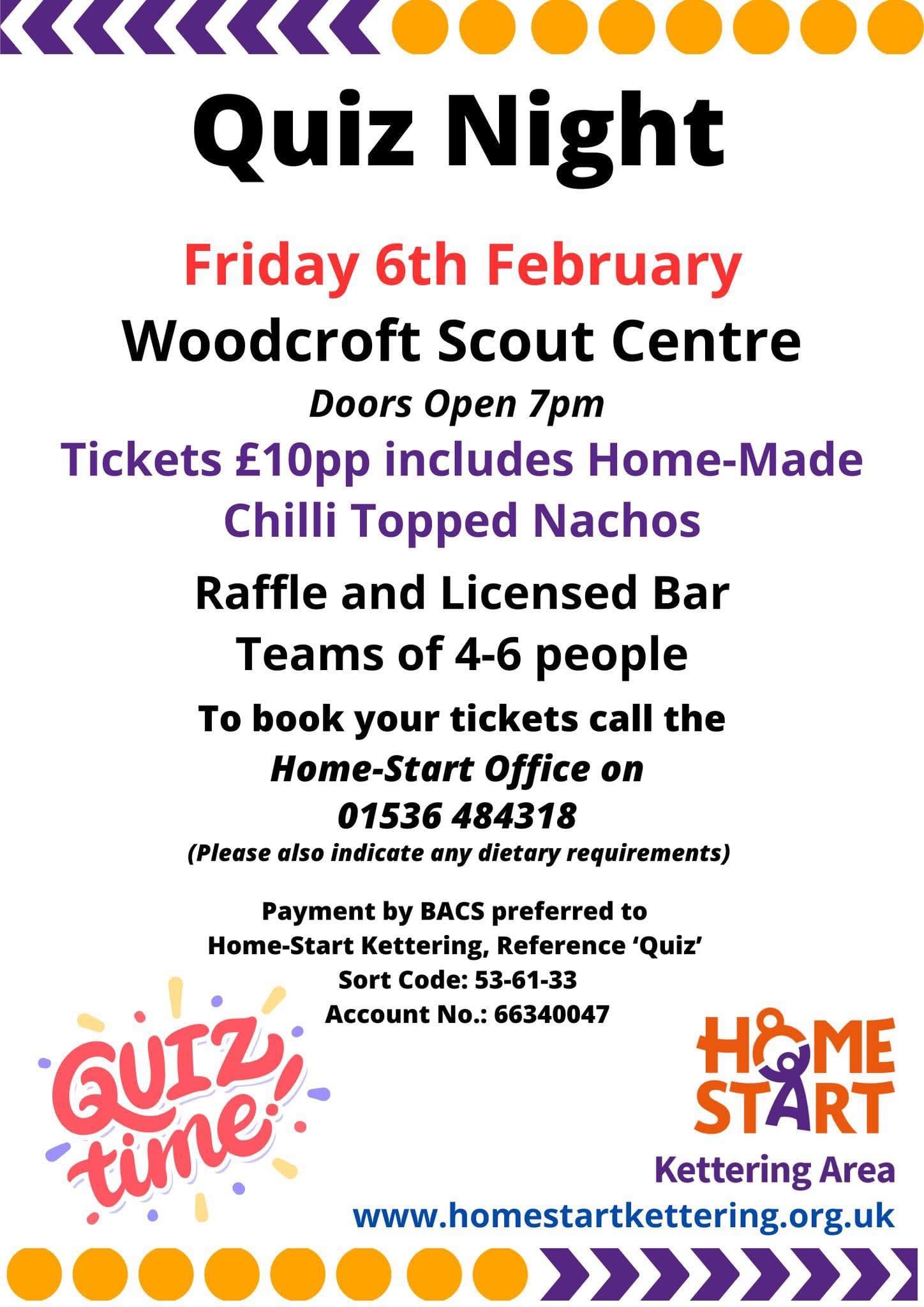 Latest News Quiz Night January 8, 2026 | by homestartkettering | 0 Comments | 0 Likes Quiz Night Friday 6th February at Woodcroft Scout Centre. Teams of 4-6 people £10pp includes a loaded chilli nachos supper. Call us to book your team in on 01536 484318 (Vegan option available on request)