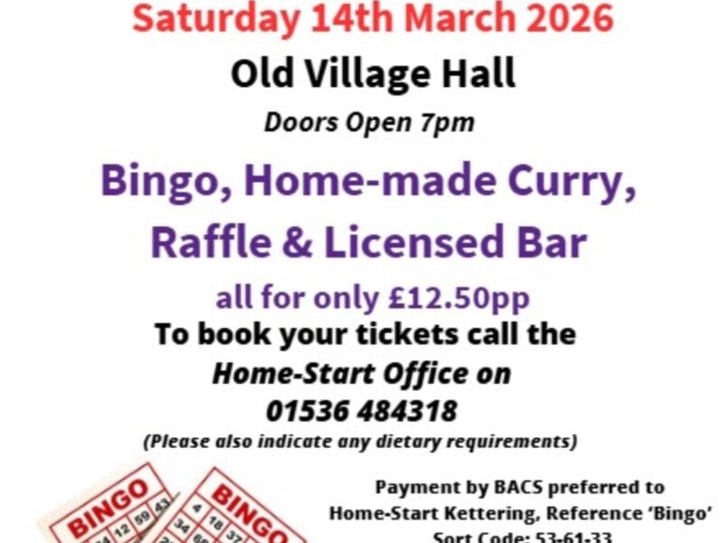 Our Bingo & Curry night is back! Saturday 14th March at Old Village Hall, Charles Cl, Old, Northampton NN6 9RQ. Doors open at 7pm. £12.5